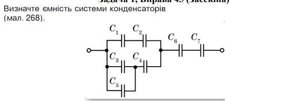 Пояснення:Для начала рассмотрим ёмкость батареи конденсаторов С(1) и С(2)C(12) = ( C(1)C(2) ) / ( C(1) + C(2) ) C(12) = ( 1 * 2 ) / ( 1 + 2 ) = ⅔ мкФТеперь рассмотрим ёмкость батареи конденсаторов С(3) и С(4)C(34) = C(3) + C(4) C(34) = 4 + 6 = 10 мкФ Только теперь полноценно рассмотрим в общую емкость батареи конденсаторов С(1) , С(2) C(3) и С(4) С(1234) = ( С(12)С(34) ) / ( C(12) + C(34) )С(1234) = ( ⅔ * 10 ) / ( ⅔ + 10 ) = 0,625 мкФ