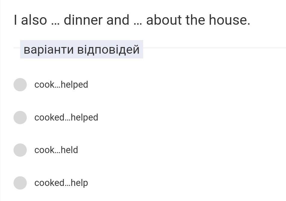 I also ... dinner and ... about the house. варіанти відповідей cook...helped cooked...helped cook...held cooked...help спасииитттеее пжжж сссроооччнооо