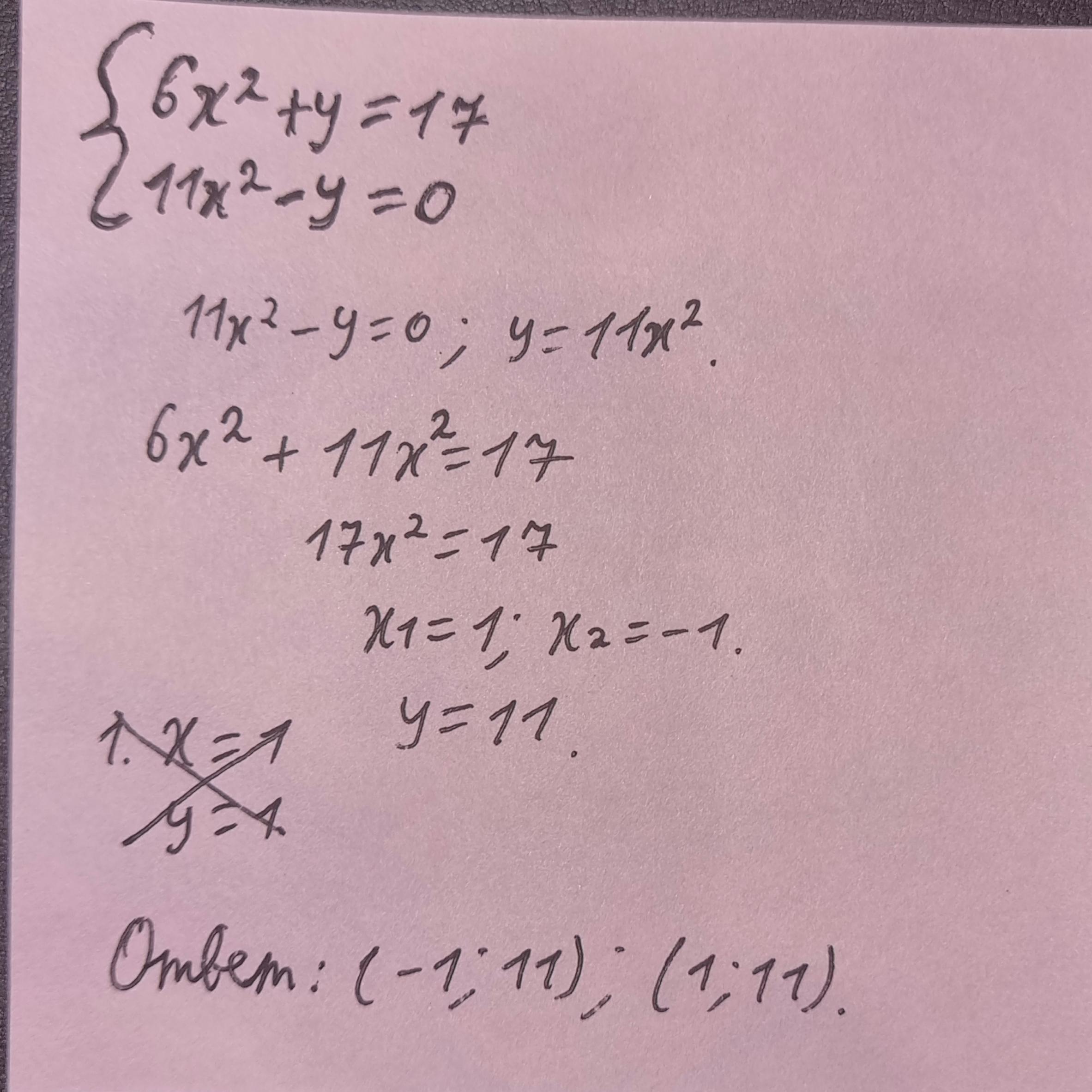 Реши систему уравнений: 6x² + y = 17, 11x² - y = 0.