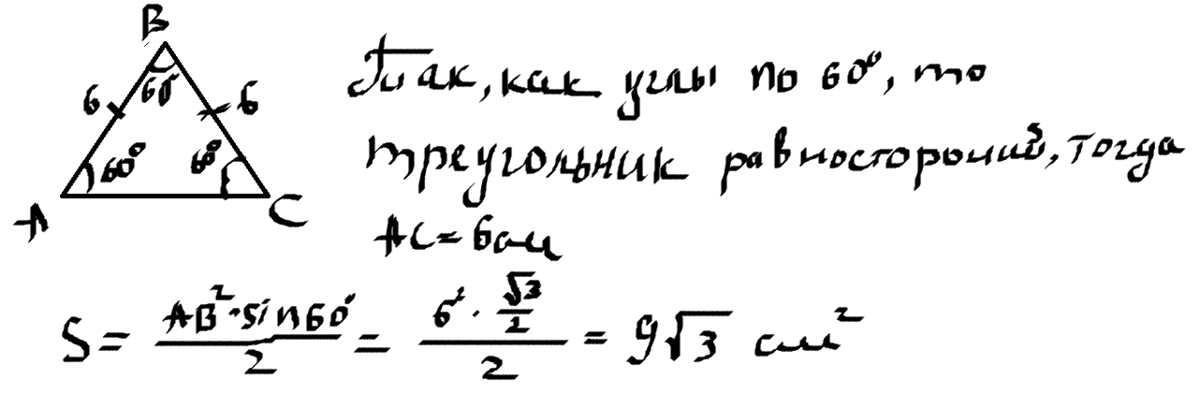Найдите площадь равнобедренного треугольника, если его боковая сторона равна 6 см а угол при вершине равен 60 градусов... с рисунком пожалуйста:*