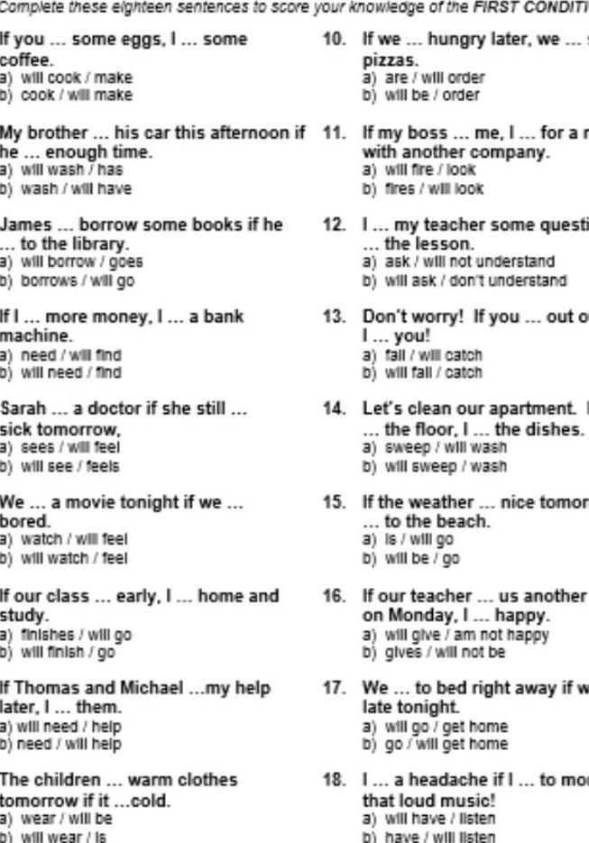 Vete these eighteen sentences to score your knowledge of the FIRST CONDITI ... some eggs, I ... some 10. If we... hungry later, we ... pizzas. ee. Il cook/make ok/ will make rother... his car this afternoon if 11. If my boss... me, I... for a r - enough time. with another company. a) will fire/look I wash/has ash/will have b) fires/will look es... borrow some books if he the library. borrow / goes rows/will go - more money, I... a bank mine. ed/will find Il need / find h... a doctor if she still ... tomorrow, es/will feel see/feels .. a movie tonight if we ... d. atch/ will feel Il watch/feel r class... early, I ... home and y. Ishes / will go finish/go omas and Michael ...my help I... them. need/help ed/will help children... warm cloth orrow if it...cold. ear/ will be wear / Is 18 Excellent a) are/will order b) will be / order 12. I... my teacher some questi ... the lesson. a) ask/will not understand b) will ask / don't understand 13. Don't worry! If you out o I... you! 14. a) fall/will catch b) will fall/catch Let's clean our apartment. ... the floor, I... the dishes. a) sweep / will wash b) will sweep/wash 15. If the weather ... nice tomor ... to the beach. a) is / will go b) will be / go 16. If our teacher... us another on Monday, I ... happy. a) will give / am not happy b) gives/will not be 15-16 Good 17. We... to bed right away if w late tonight. a) will go/get home b) go/will get home 18. I... a headache if I ... to mo that loud music! a) will have listen b) have/will listen 14 or Less = Study M