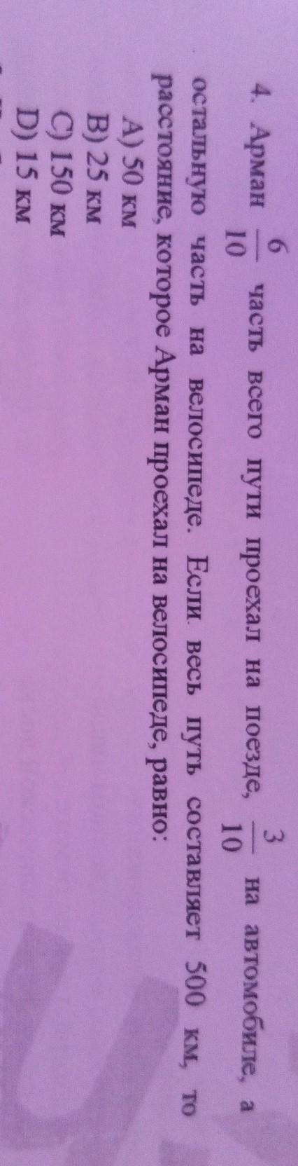 6 4. Арман 6\10 часть всего пути проехал на поезде, 3\10 на автомобиле, а остальную часть на велосипеде. Если весь путь составляет 500 км, то расстояние, которое Арман проехал на велосипеде, равно: - А) 50 км B) 25 км C) 150 км D) 15 KM