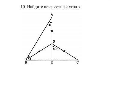 ΔАВD - равнобедренный по условию, значит ∠х=∠АВD=10°