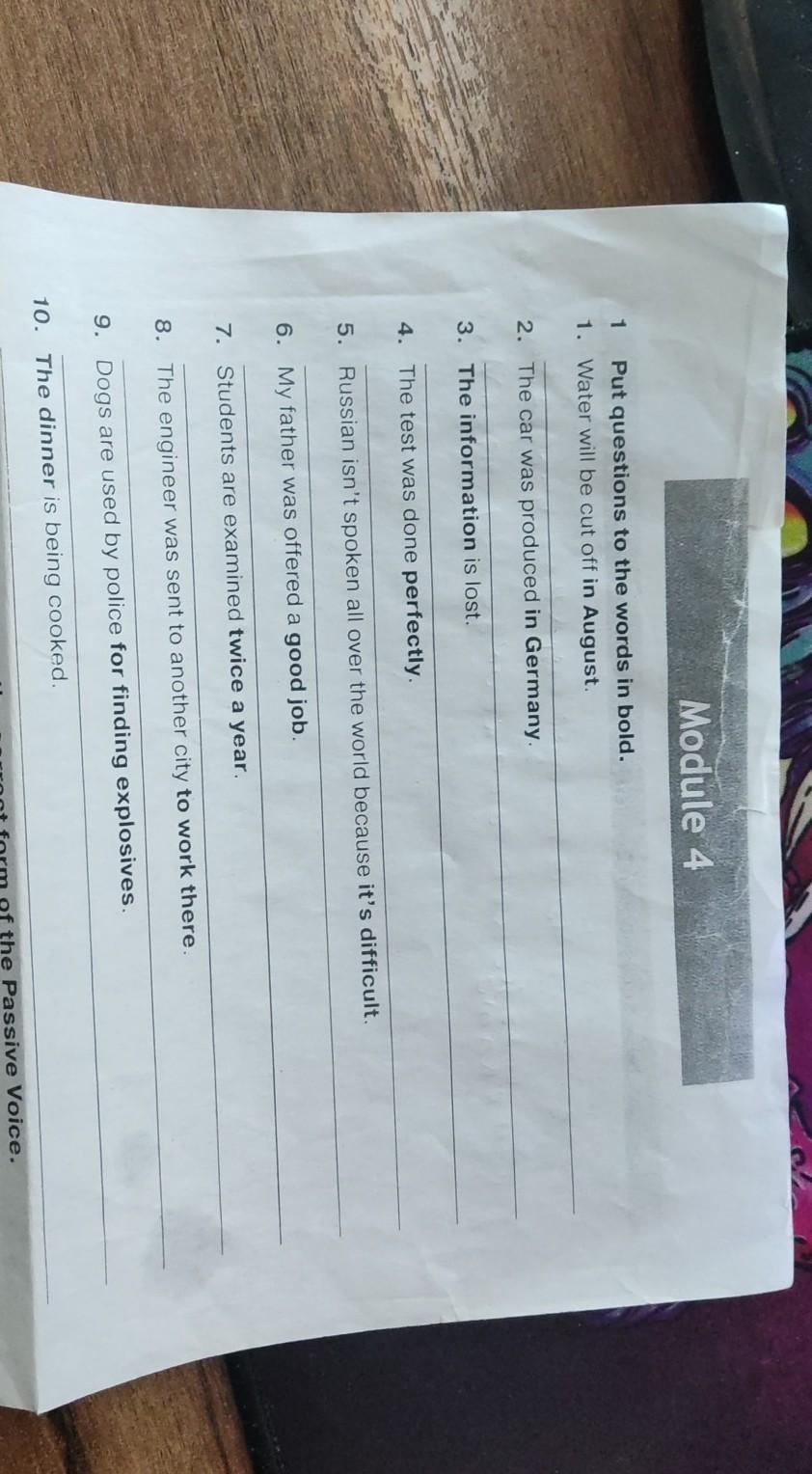 Put questions to the words in bold 1)water will be cut off in august 2) the car was produced in germany 3)the information is lost 4) the test was done perfectly 5)russian isnt spoken all over the world because its difficult 6)my father was offered a good job 7)students are examuned twice a year 8)the engineer was sent to another city to work there 9)dogs are used by police for finding explosives 10) the dinner is being cooked
