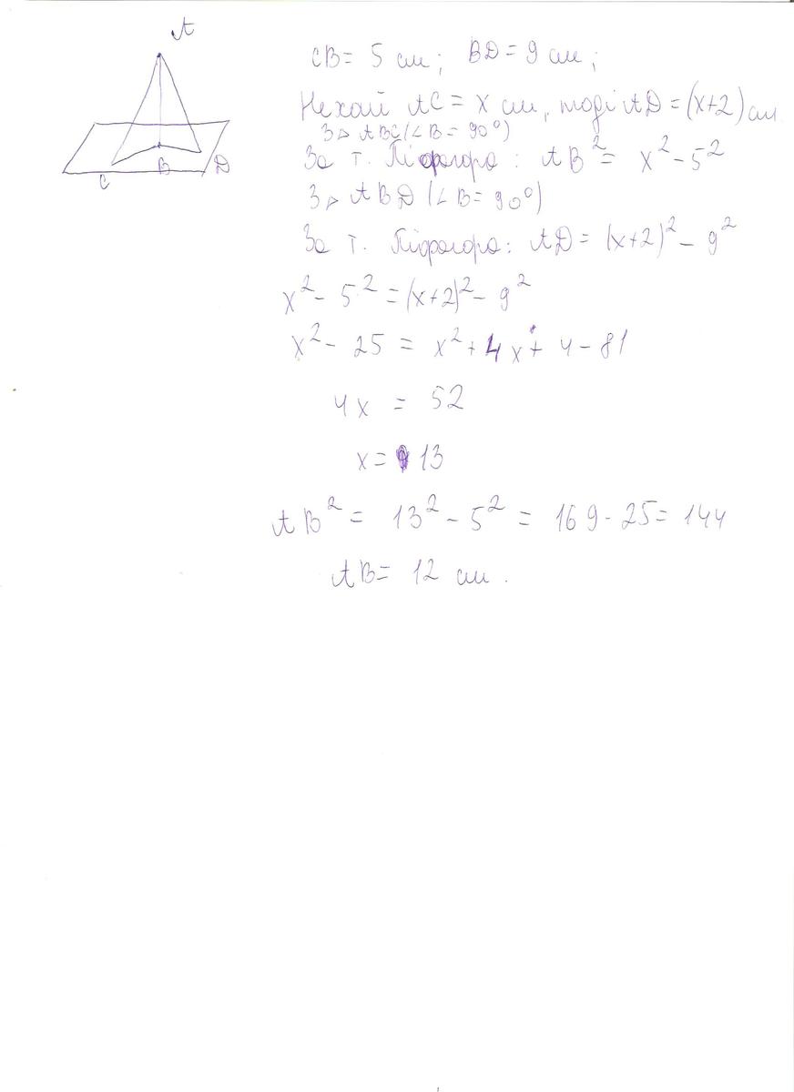 З точки до прямої проведено дві похилі, проекції яких на пряму дорівнюють 5 см і 9 см. Знайдіть відстань від даної точки до цієї прямої, якщо одна з похилих на 2 см більша за другу.