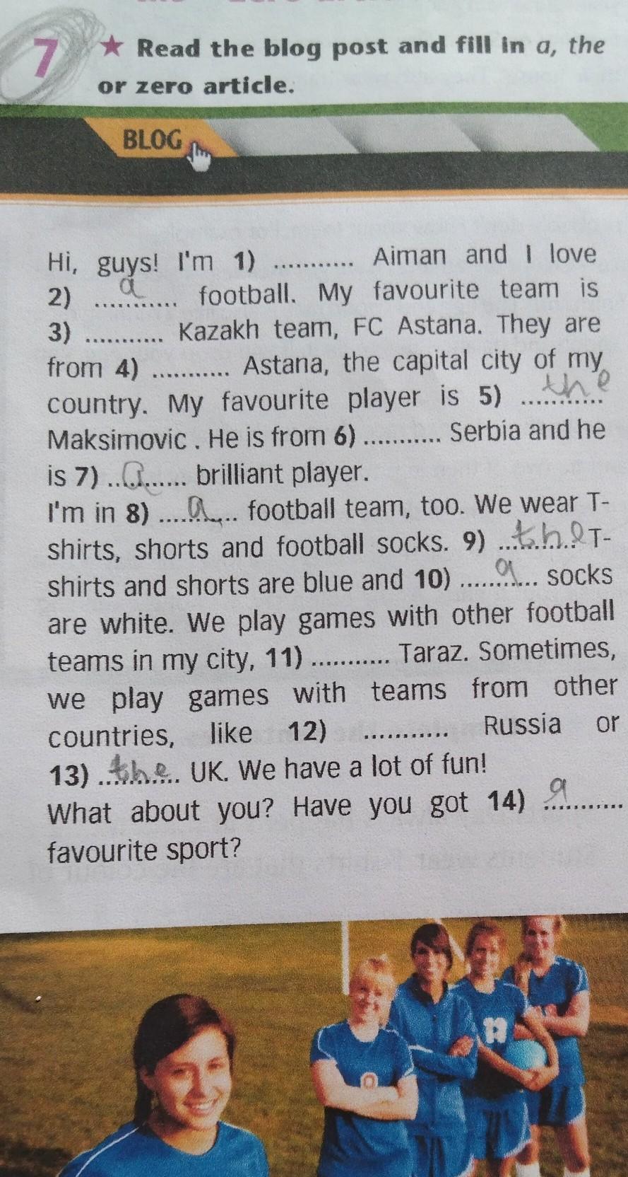 7 * Read the blog post and fill in a, the or zero article. BLOG Hi guys! I'm 1) 2) 3) Aiman and I love football. My favourite team is Kazakh team, FC Astana. They are Astana, the capital city of my country. My favourite player is 5) Maksimovic. He is from 6)............ Serbia and he is 7)............ brilliant player. from 4) I'm in 8)..... football team, too. We wear T- shirts, shorts and football socks. 9) ........... T- socks shirts and shorts are blue and 10) are white. We play games with other football teams in my city, 11) ............ Taraz. Sometimes, we play games with teams from other 12) countries, like Russia or 13)........... UK. We have a lot of fun! What about you? Have you got 14) favourite sport? PERMERRY ******* ***********