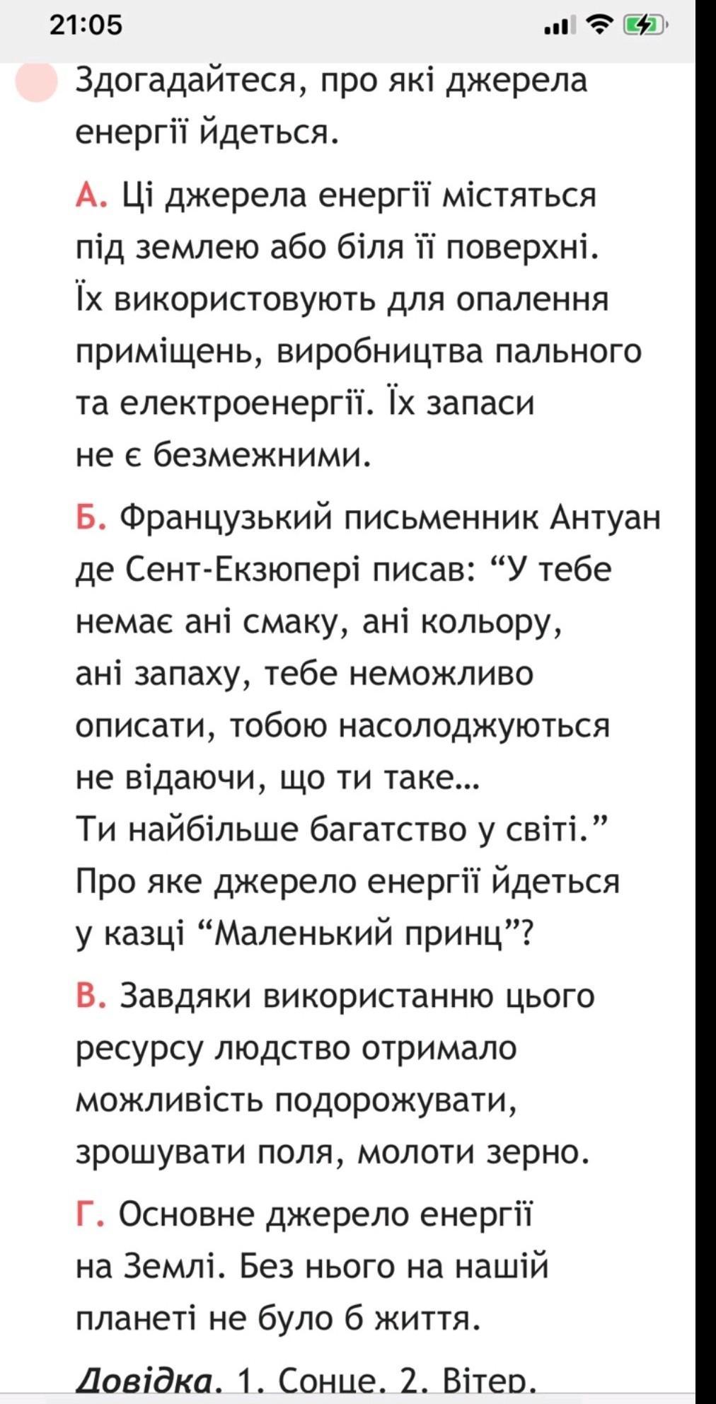 Потрібно написати А Б В Г там потрібно дізнатися про які джерела енергії йдеться.