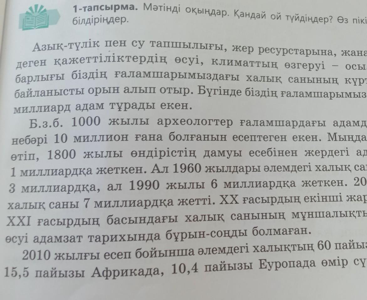 1-тапсырма. Мәтінді оқыңдар. Қандай ой түйдіңдер? Өз пікірлеріңді білдіріңдер. Азық-түлік пен су тапшылығы, жер ресурстарына, жанармайға деген қажеттіліктердің өсуі, климаттың өзгеруі осылардың барлығы біздің ғаламшарымыздағы халық санының күрт өсуіне байланысты орын алып отыр. Бүгінде біздің ғаламшарымызда 7,520 миллиард адам тұрады екен. Б.з.б. 1000 жылы археологтер ғаламшардағы адамдар саны небәрі 10 миллион ғана болғанын есептеген екен. Мыңдаған жыл өтіп, 1800 жылы өндірістің дамуы есебінен жердегі адам саны 1 миллиардқа жеткен. Ал 1960 жылдары әлемдегі халық саны бірден 3 миллиардқа, ал 1990 жылы 6 миллиардқа жеткен. 2011 жылы халық саны 7 миллиардқа жетті. ХХ ғасырдың екінші жартысы мен ХХІ ғасырдың басындағы халық санынын мұншалықты жылдам өсуі адамзат тарихында бұрын-соңды болмаған. 2010 жылғы есеп бойынша әлемдегі халықтың 60 пайызы Азияда, 15,5 пайызы Африкада, 10,4 пайызы Еуропада өмір сүрген. Әлем диаграмма
