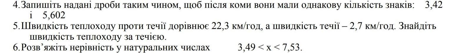 5.Швидкість теплоходу проти течи дорівнює 22,3 км/год, а швидкість течі1 - 2,7 км/год. Знайдіть швидкість теплоходу за течією. 6.Розв’яжіть нерівність у натуральних числах 3,49