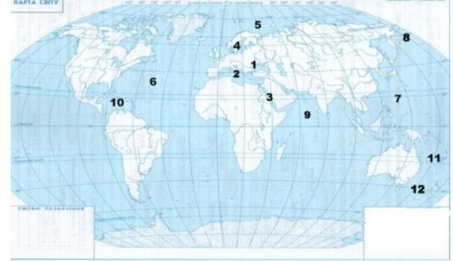 7. Північний Тихий океан. 8. Берингове море. 9. Аравійське море. 10. Карибське море. 11. Каралове море. 12. Тасманове море.