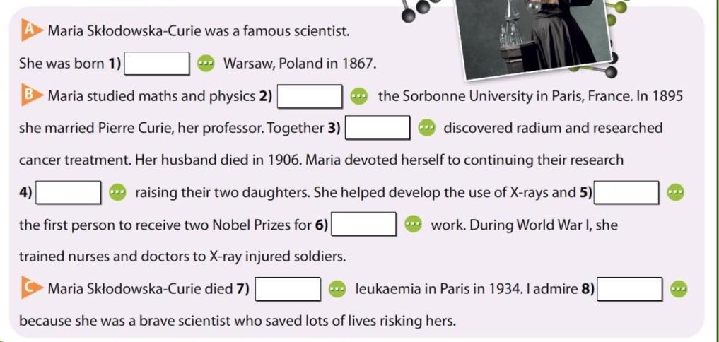 Maria Skłodowska-Curie was a famous scientist. She was born 1) Warsaw, Poland in 1867. Maria studied maths and physics 2) she married Pierre Curie, her professor. Together 3) cancer treatment. Her husband died in 1906. Maria devoted herself to continuing their research raising their two daughters. She helped develop the use of X-rays and 5) work. During World War I, she 4) the Sorbonne University in Paris, France. In 1895 discovered radium and researched the first person to receive two Nobel Prizes for 6) trained nurses and doctors to X-ray injured soldiers. Maria Skłodowska-Curie died 7) because she was a brave scientist who saved lots of lives risking hers. leukaemia in Paris in 1934. I admire 8)