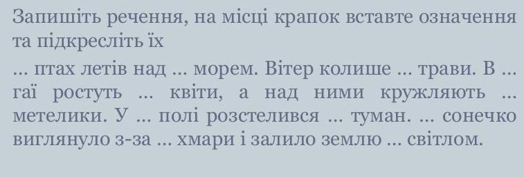 Відповідь:Великий птах летів над блакитним морем.Вітер колише зелені трави.В гаї ростуть червоні квіти ,а над ним кружляють різнокольорові метелики.У безкрайньому полі розселився густий туман.Яскраве сонечко виглянуло з-за одинокої хмаринки і залило землю своїм світлом
