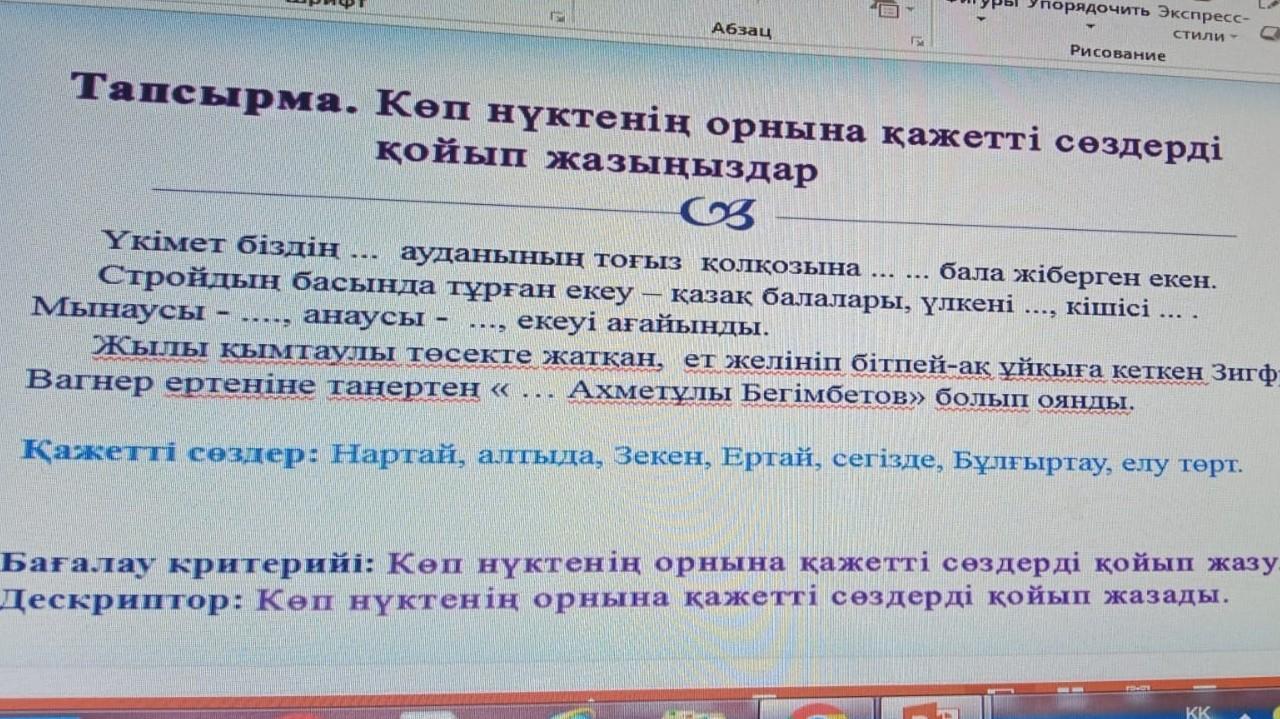 Макет 3] Сбросить Раздел - айды ДИЗАЙН ПЕРЕХОДЫ W таның балалары - PowerPoint (Сбой активации продукта) АНИМАЦИЯ ПОКАЗ СЛАЙДОВ A A A E - . . If M [3] жкч S abc AV- Aa - A Шрифт Үкімет біздің . ... - F - EE Абзац ... РЕЦЕНЗИРОВАНИЕ M Б Тапсырма. Көп нүктенің орнына қажетті сөздерді койып жазыңыздар Os ... ... ВИД Фигуры упорядочить Экспресс- стили P Рисование ауданының тоғыз колкозына Стройдын басында тұрған екеу - қазақ балалары, үлкені Мынаусы - ..... анаусы екеуі ағайынды. ---D Жылы кымтаулы төсекте жатқан, ет желініп бітпей-ақ ұйқыға кеткен Зигфрид Вагнер ертеніне танертен « Ахметұлы Бегімбетов» болып оянды. Қажетті сөздер: Нартай, алтыда, Зекен, Ертай, сегiзде, Бұлғыртау, елу терт. --- бала жіберген екен. кішісі ... . Бағалау критерийі: Көп нүктенің орнына қажетті сөздерді қойып жазу. Дескриптор: Көп нүктенің орнына қажетті сөздерді қойып жазады. A Sa КК ? В А найти Фас Заменить - Выделить Редактирование 06.