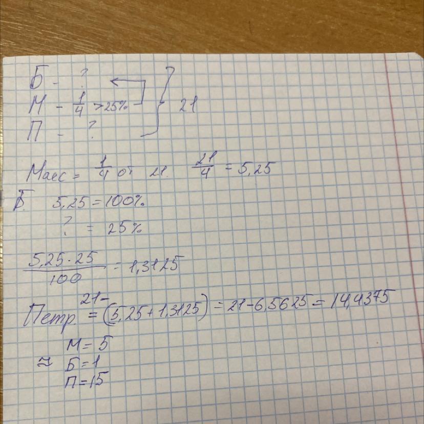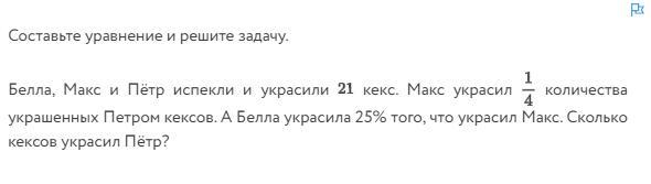 25% какого-то количества - это ровно четверть его. Поэтому если Белла украсила x кексов, то Макс украсил в 4 раза больше, то есть 4x кексов, а поскольку Пётр украсил в 4 раза больше, чем Макс, то Пётр украсил 4·(4x)=16x кексов. Суммарно был украшен 21 кекс, поэтому x+4x+16x=21. Получили уравнение