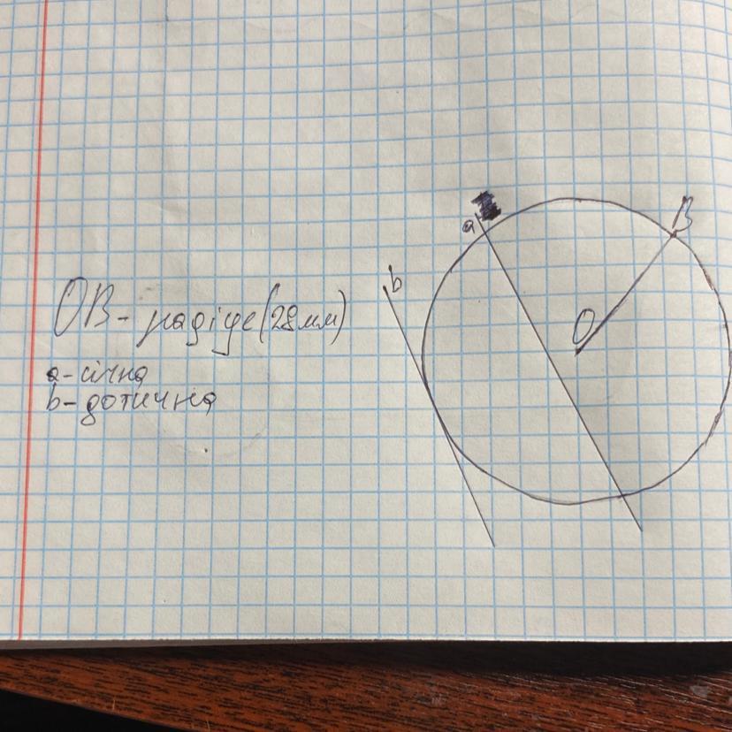 Накресліть коло радіус якого дорівнює 28 мм.проведіть пряму а,яка є січною для кола та пряму b яка не перетинає коло.