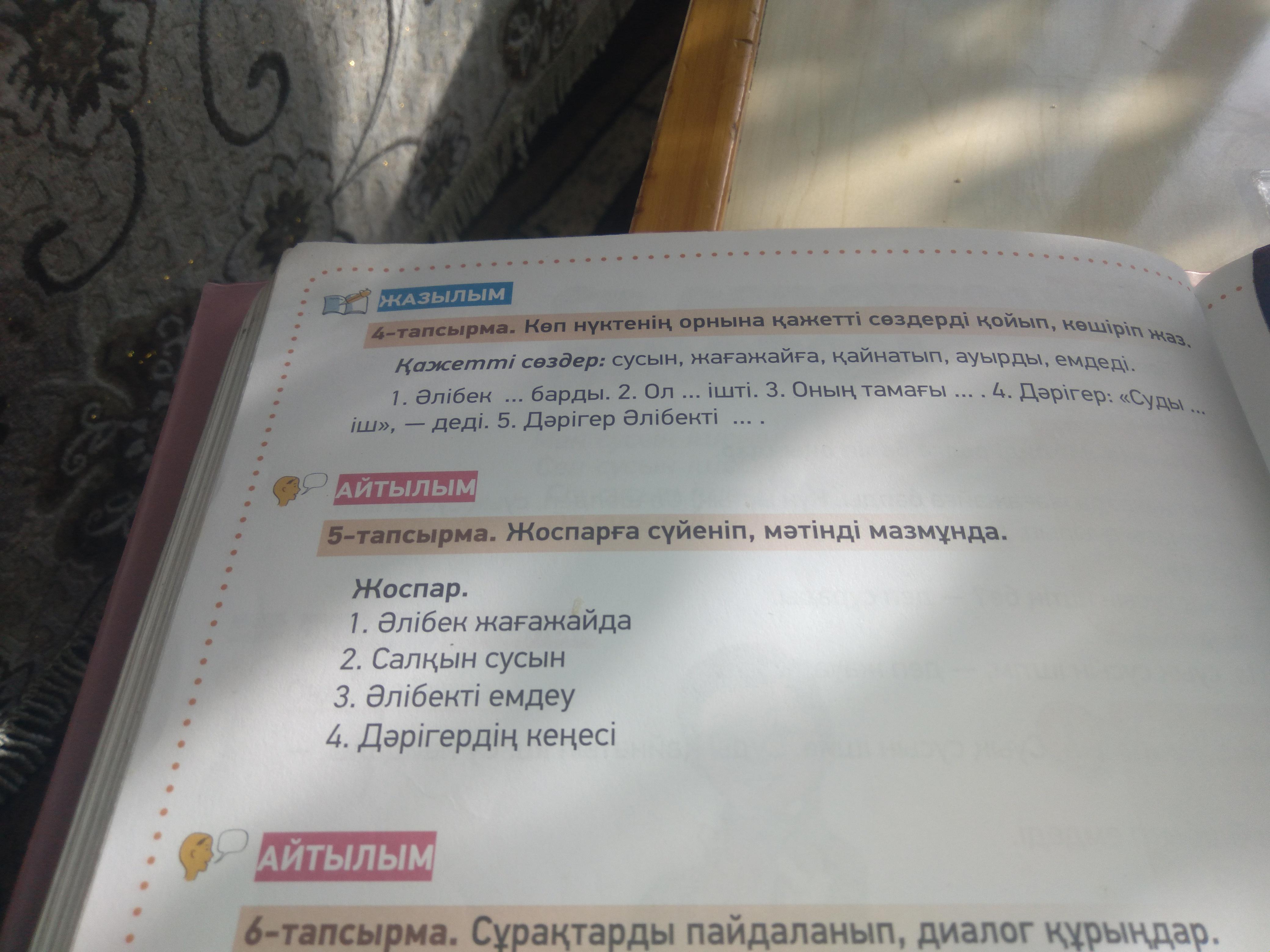 1.Әлібек жағажайға барды. 2.Ол сусын ішті. 3.Оның тамағы ауырды. 4.Дәрігер:«Суды қайнатып іш»,-деді. 5.Дәрігер Әлібекті емдеді.