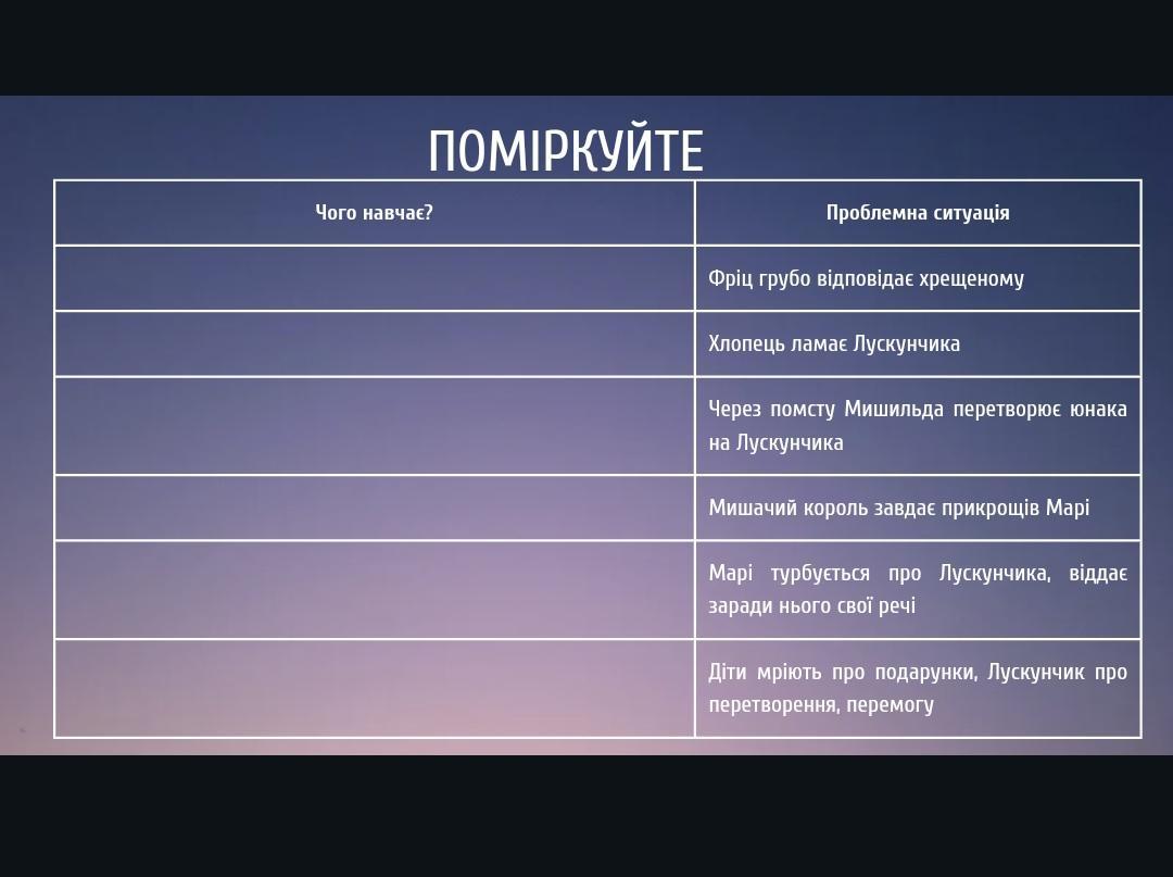 Ліву частину таблиці про проблемні ситуації в казці, чого вони нас навчають? на фото