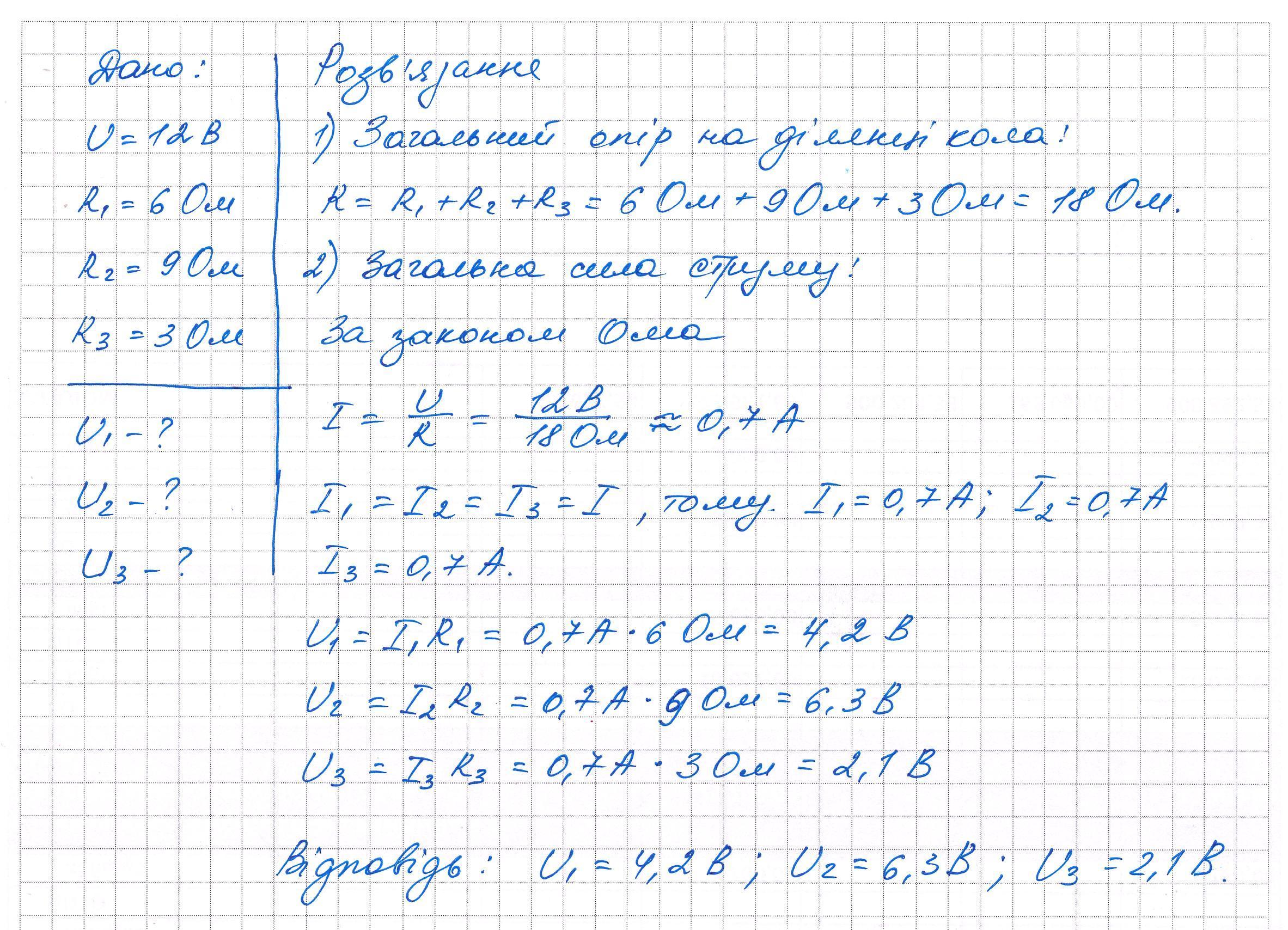 До ділянки кола з послідовно з'єднаних резисторів прикладена напруга 12В. Опори резисторів відповідно дорівнюють 6 Ом, 9 Ом, 3 Ом. Чому дорівнює напруга на кожному резисторі?