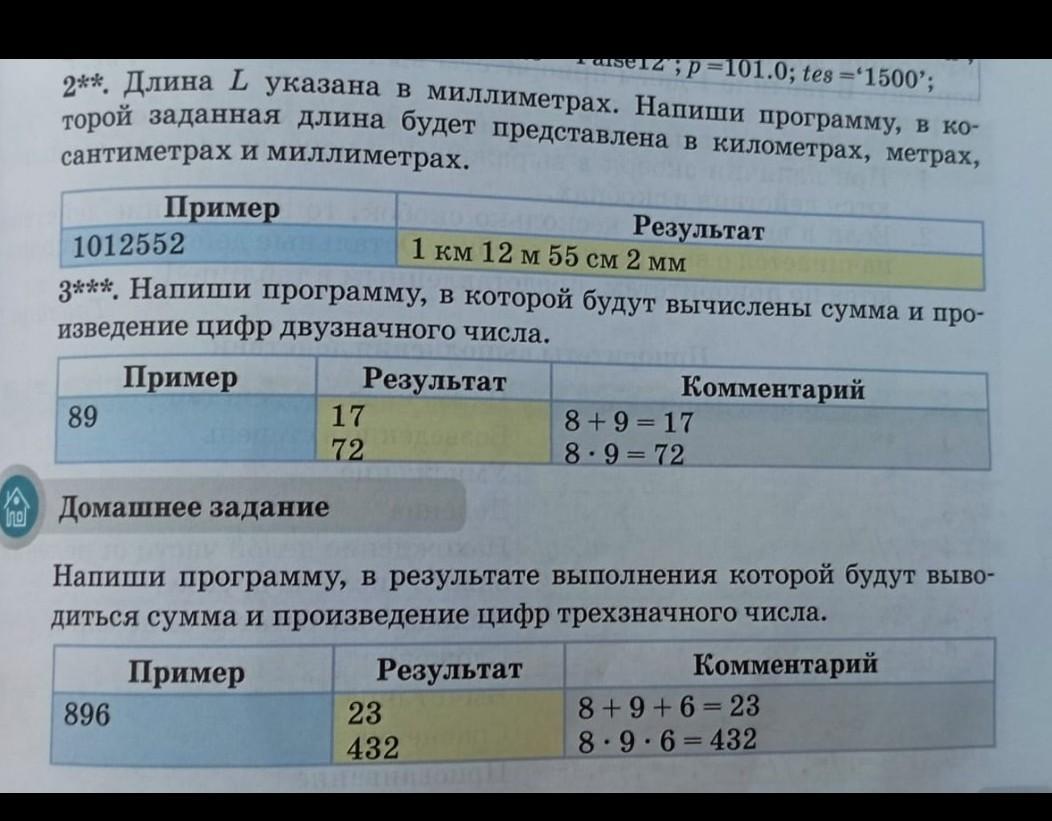 3*** Напиши программу, в которой будут вычислены сумма и про- изведение цифр двузначного числа. Пример Результат Комментарий 89 17 72 896
