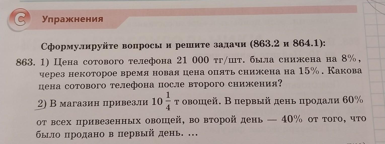 19320 * 0.85 = 16422 тг - новая цена после второго снижения.Ответ: цена сотового телефона после второго снижения составит 16 422 тг.863.2)