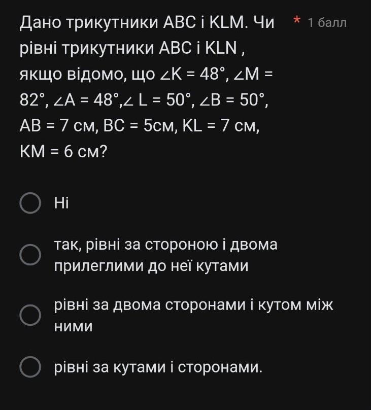 Дано трикутники ABC і KLM. Чи рівні трикутники ABC і KLN, якщо відомо, що angle K = 48 deg , angle M = 82 deg angle A = 48 deg angle L = 50 deg , angle B = 50 deg AB = 7CM BC = 5cM KL = 7CM