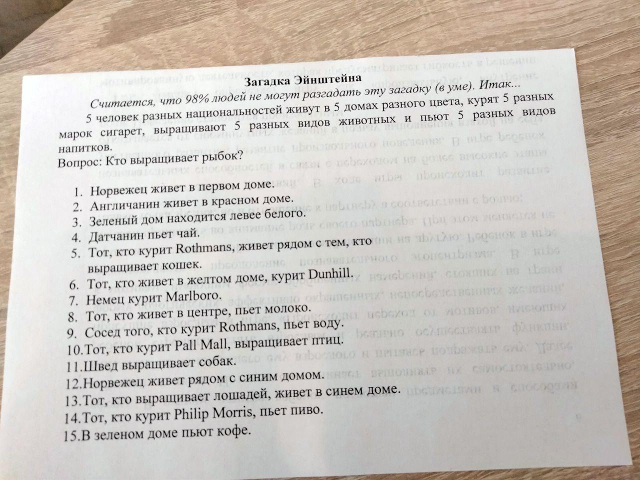 Эта загадка является классическим примером головоломки про логическое мышление. Есть пять домов, расположенных в линию, каждый разного цвета. В каждом доме живет человек разной национальности, который пьет определенный напиток, курит определенные сигареты и выращивает определенное животное. Загадка заключается в том, чтобы определить, кто из пяти владельцев домов выращивает рыбок.