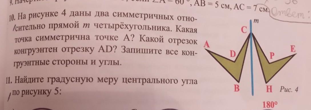 l 10. На рисунке 4 даны два симметричных отно- /сительно прямой м четырёхугольника. Какая точка симметрична точке А? Какой отрезок конгруентен отрезку AD? Запишите все кон- груэнтные стороны и углы. D m см. ответ P E