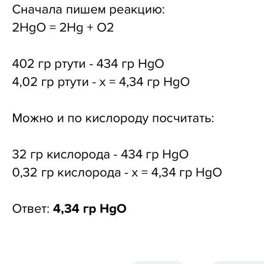 під час реакції розкладу меркурій(ll)оксиду (HgO) утворилася ртуть масою 4,02 г і кисень масою 0,32 г Складіть рівняння цієї реакції.Обчисліть масу Меркурій(ll) оксиду.