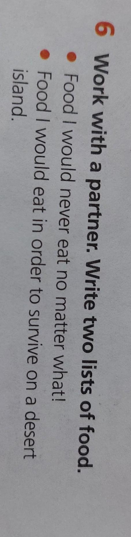 6 Work with a partner. Write two lists of food. • Food I would never eat no matter what! Food I would eat in order to survive on a desert island