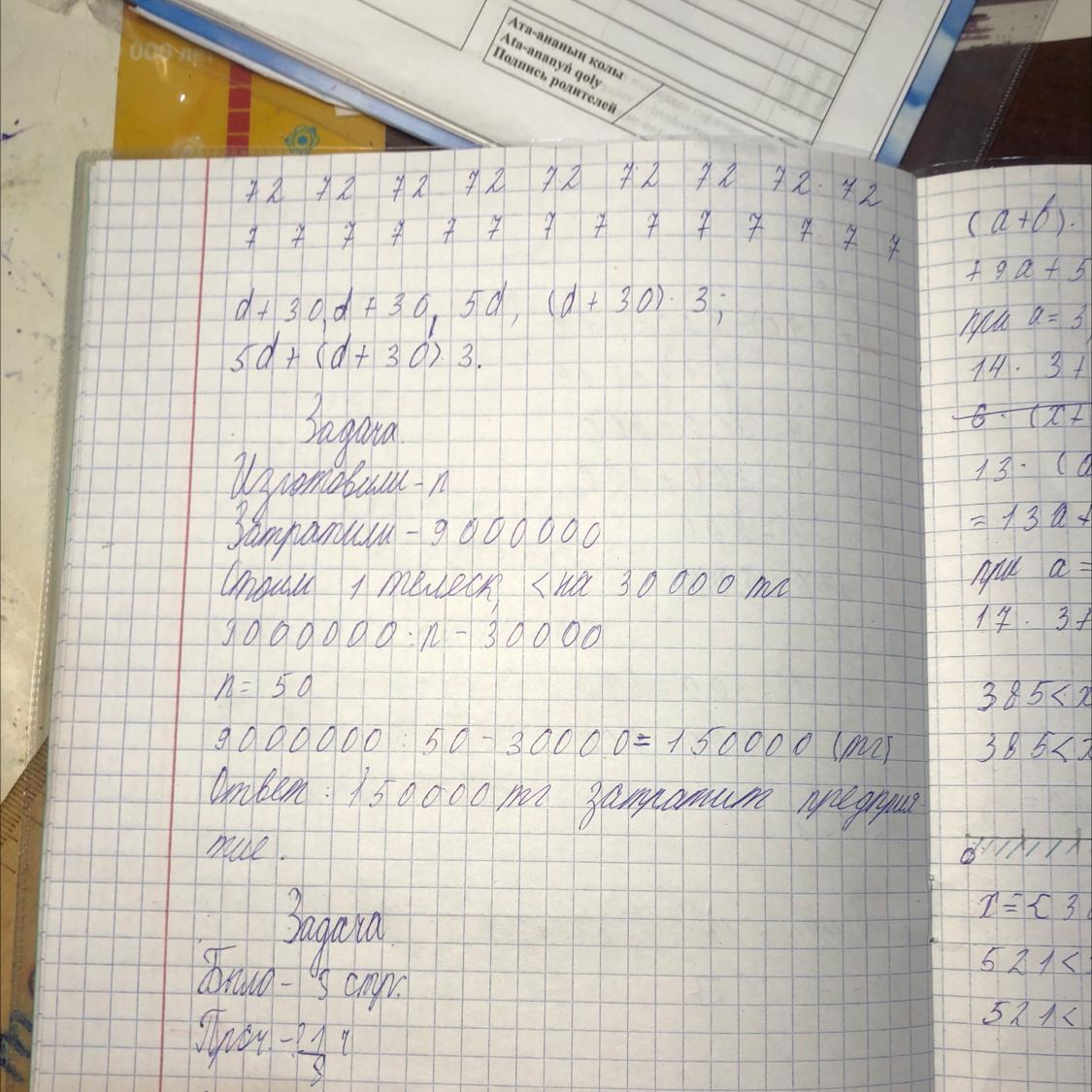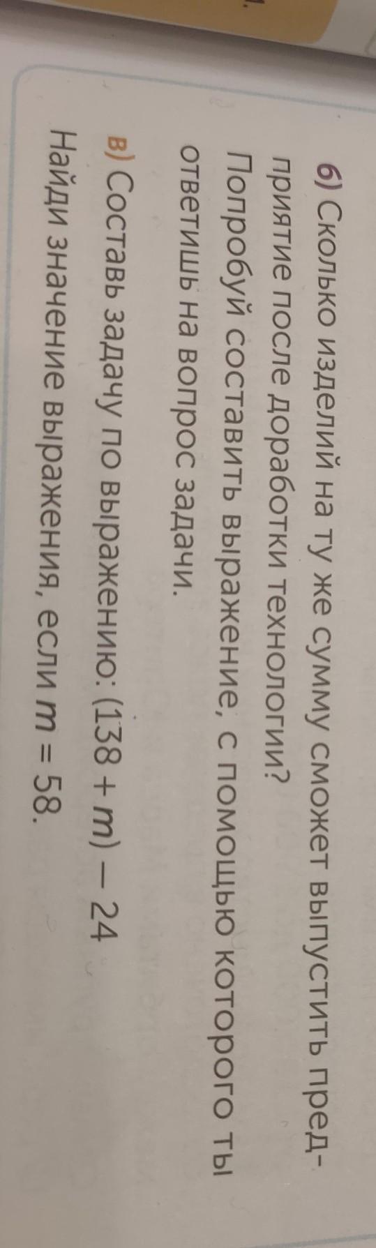 Выполни задания. 3 a) Составь выражение. Для производства и телескопов предприятие должно затратить 9 000 000 тенге. После доработки технологии стоимость изготовления одного телескопа уменьшилась на 30 000 тенге. Сколько тенге затратит предприятие на изготовление одного телескопа после доработки? Вычисли, подставив значение n = 50. 6) Сколько изделий на ту же сумму сможет выпустить пред- приятие после доработки технологии? Попробуй составить выражение, с помощью которого ты ответишь на вопрос задачи. в) Составь задачу по выражению: (138 + m) – 24 58. Найди значение выражения, если m =