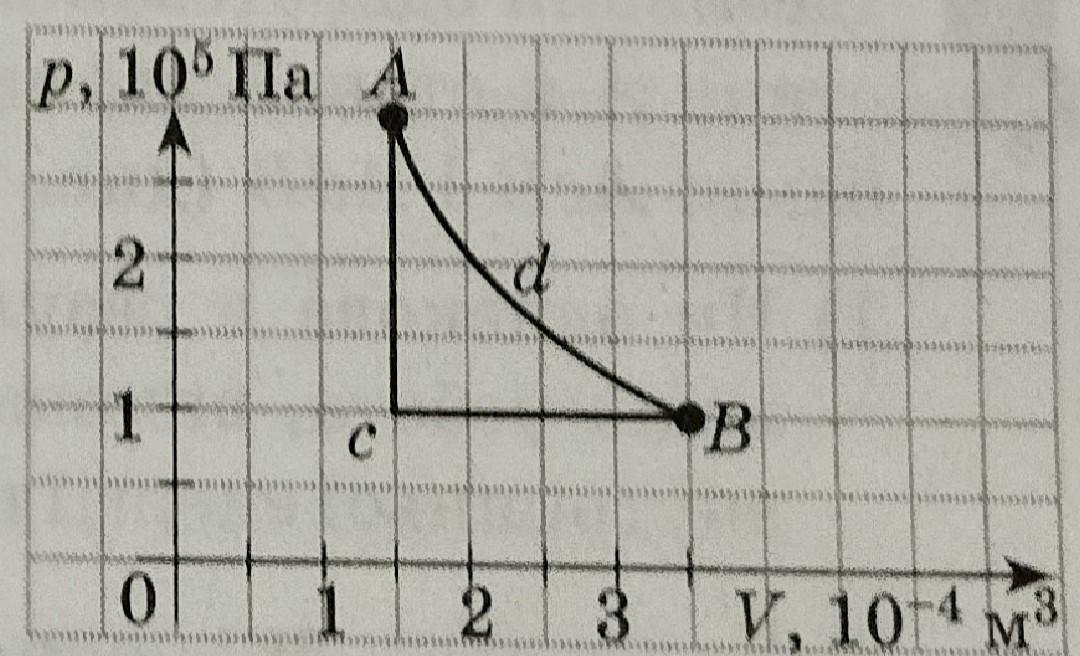 Ідеальний газ деякої маси переходить зі стану А в стан В двома різними способами: АсВ і AdB (див. мал.).