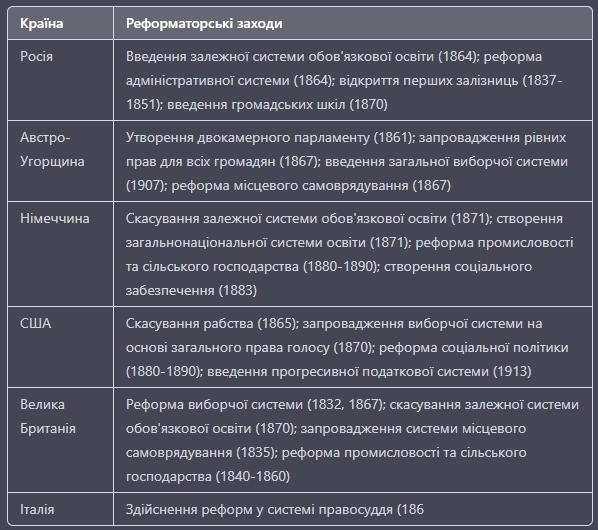 Для надання відповіді на запитання необхідно скласти таблицю, що включає реформаторські заходи, які здійснювалися під впливом модернізаційних процесів урядами Росії, Австро-Угорщини, Німеччини, США, Великої Британії та Італії у XIX та на початку XX століття.