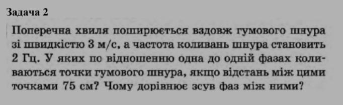 Поперечна хвиля поширюється вздовж гумового шнура зі швидкістю 3 м/с, а частота коливань шнура становить 2 Гц. У яких по відношенню одна до однiй фазах коли- ваються точки гумового шнура, якщо вiдстань між цими точками 75 см? Чому дорівнює зсув фаз мiж ними?