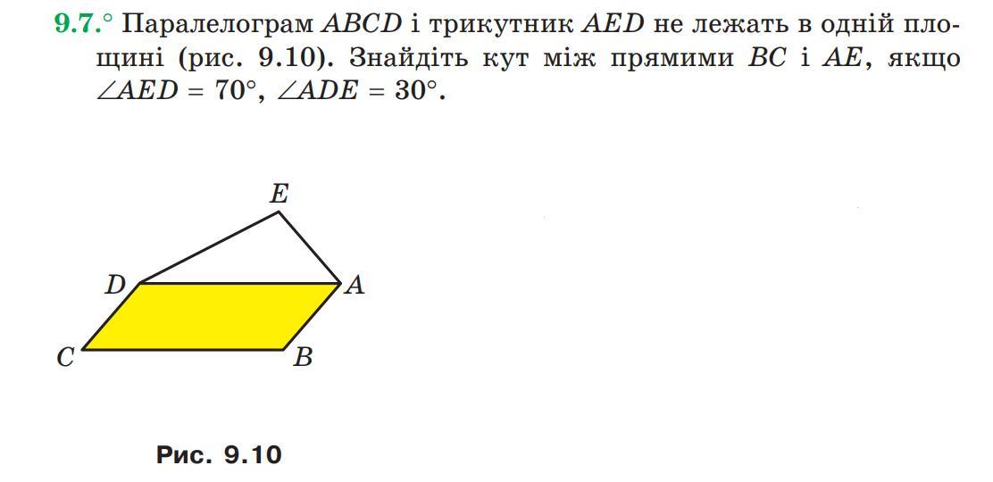 Паралелограм ABCD і трикутник AED не лежать в одній площині (рис. 9.10 на фото). Знайдіть кут між прямими BC і AE, якщо ∠AED = 70°, ∠ADE = 30°.