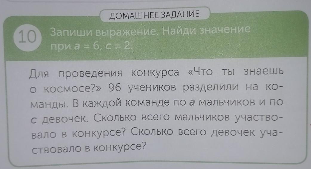 ДОМАШНЕЕ ЗАДАНИЕ 10 Запиши выражение. Найди значение при а = 6, с = 2. Для проведения конкурса «Что ты знаешь о космосе?» 96 учеников разделили на ко- манды. В каждой команде по а мальчиков и по с девочек. Сколько всего мальчиков участво- вало в конкурсе? Сколько всего девочек участвовало в конкурсе.