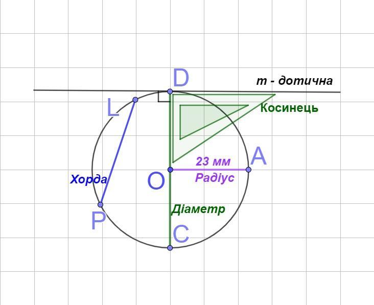 Накресліть коло радіуса 23 мм. Проведіть у ньому діаметр CD та хорду PL. Проведіть за допомогою косинця дотичну до кола, що проходить через точку С.