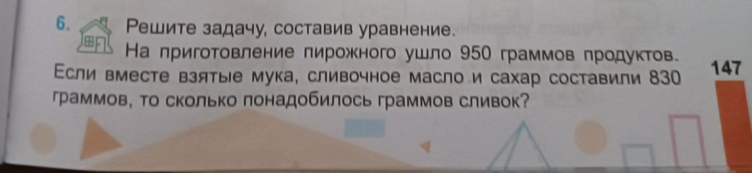 Решите задачу, составив уравнение. На приготовление пирожного ушло 950 граммов продуктов. Если вместе взятые мука, сливочное масло и сахар составили 830 граммов, то сколько понадобилось граммов сливок? помогите пожалуйста срочно¡¡¡!!!!!!!!!!¡¡¡¿¿¿¡¡¡???¡¡¡¡!!!!!!!!!!!