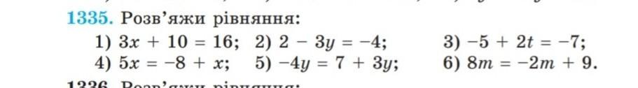 1)3x+10=16 4)5x=-8+x 2)2-3y=-4 3)-5+2t=-7 5)-4y=7+3y