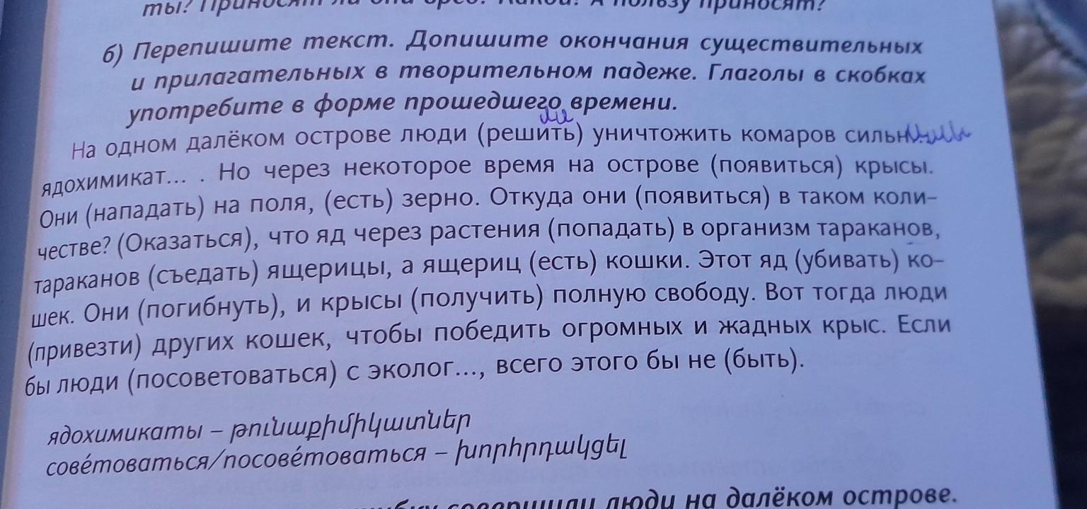 На одном далеком острове люди решили уничтожить комаров сильнодействующими ядохимикатами. Но через некоторое время на острове появились крысы. Они нападали на поля и ели зерно. Откуда они появились в таком количестве? Оказалось, что яд через растения попадали в организм тараканов. Тараканы съедали ящериц, а ящерицы ели кошек. Этот яд убивал кошек. Они погибли, и крысы получили полную свободу. Тогда люди привезли других кошек, чтобы победить огромных и жадных крыс. Если бы люди посоветовались с экологами, всего этого бы не было.