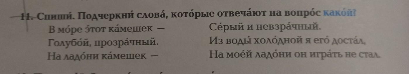 11. Спиши. Подчеркни слова, которые отвечают на вопрос какой? в море этот камешек Сéрый и невзрачный. Голубой, прозрачный. На ладони камешек - Из воды холодной я его достал, На моей ладони он играть не стал.