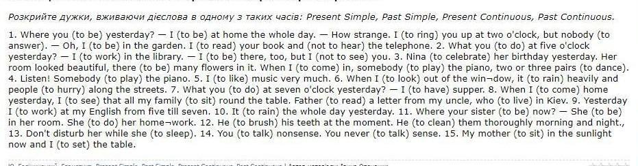 1) Where you were yesterday?- I was at home whole day,- How strange. I was ringing you up at 2 oclock, but nobody answered,- Oh I was in the garden. I was reading your book, and did not hear the telephone.