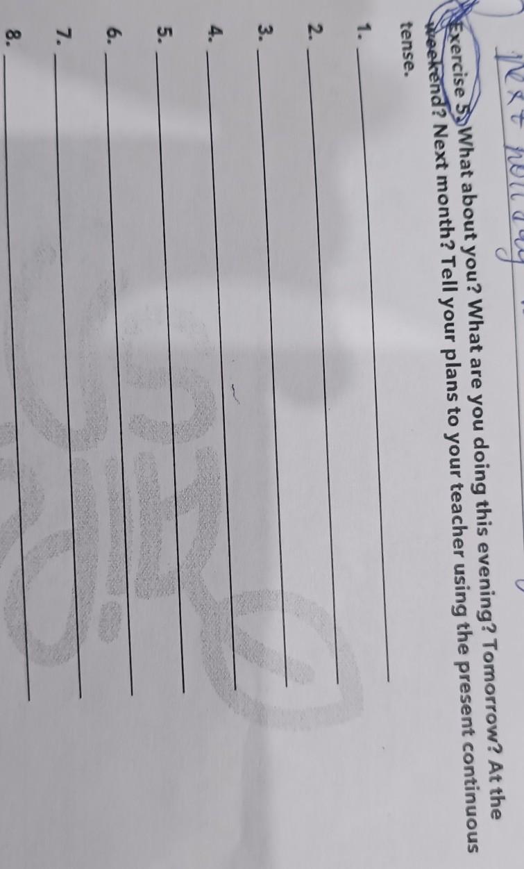 Exercise 5 What about you? What are you doing this evening? Tomorrow? At the weekend? Next month? Tell your plans to your teacher using the 1. 2. 3. 4. 5. 6. 7. 8. "СРОЧНО НАДО В present continuous tense. "