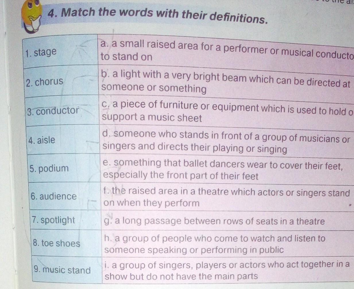 4. Match the words with their definitions. 1. stage 2. chorus 3. conductor 4. aisle 5. podium 6. audience 7. spotlight 8. toe shoes 9. music stand a. a small raised area for a performer or musical conductor to stand on b. a light with a very bright beam which can be directed at someone or something c. a piece of furniture or equipment which is used to hold or support a music sheet d. someone who stands in front of a group of musicians or singers and directs their playing or singing e. something that ballet dancers wear to cover their feet, especially the front part of their feet f. the raised area in a theatre which actors or singers stand on when they perform g. a long passage between rows of seats in a theatre h. a group of people who come to watch and listen to someone speaking or performing in public i. a group of singers, players or actors who act together in a show but do not have the main parts