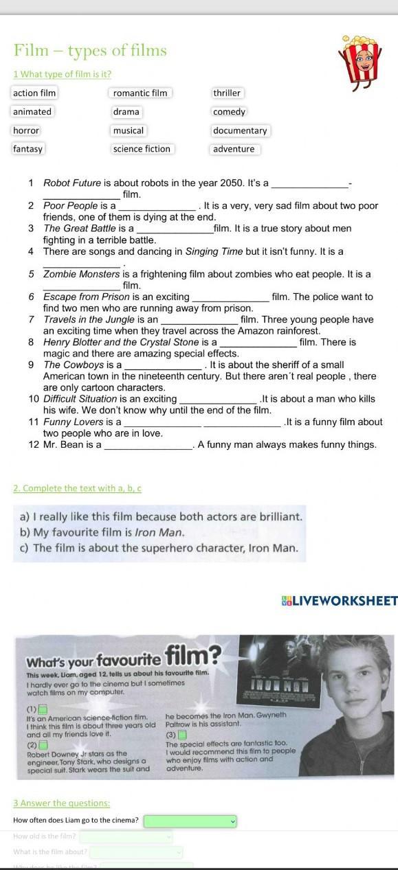 1. 1 science fiction, 2 drama, 3 documentary, 4 musical, 5 horror, 6 action film, 7 adventure, 8 fantasy, 9 animated, 10 thriller, 11 romantic film, 12 comedy