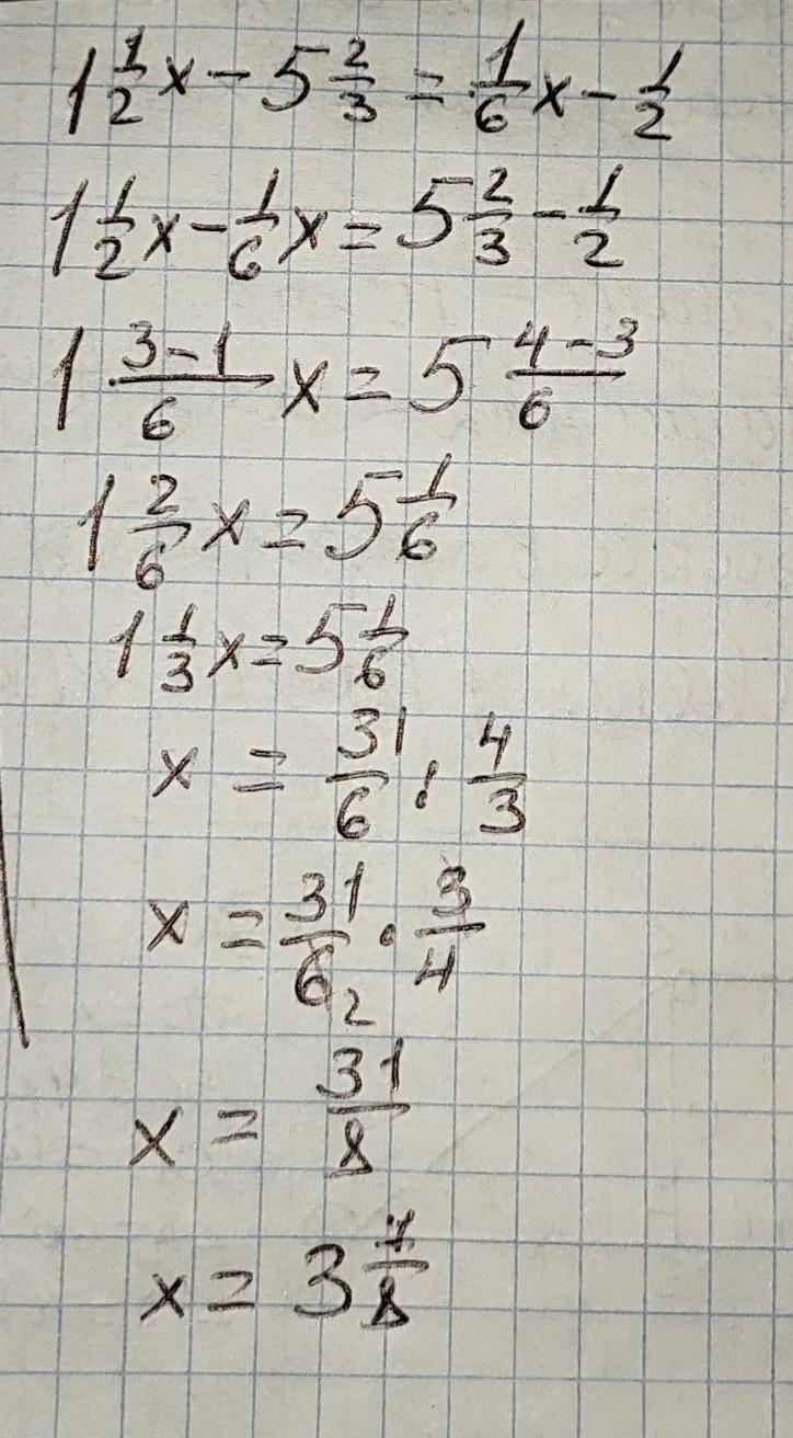 Срочно дам 15 балов 1 1/2x-5 2/3=1/6x-1/2