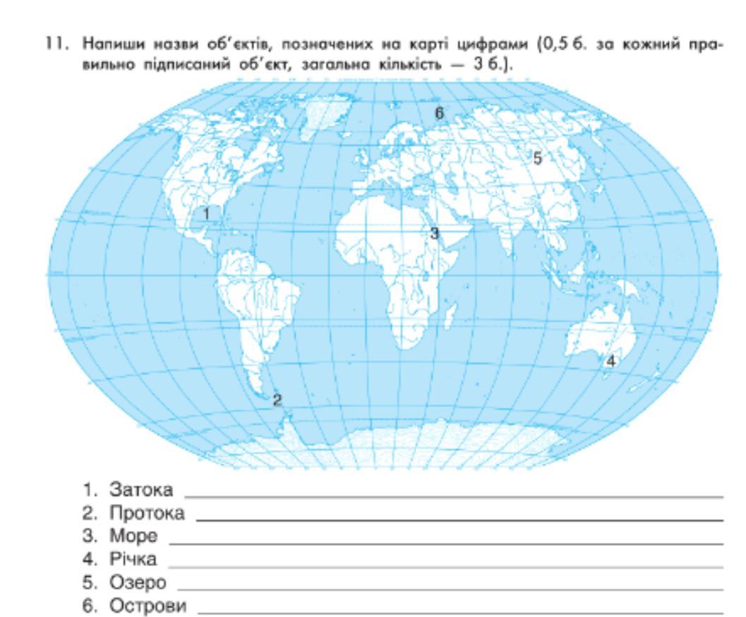11. Напиши назви об'єктiв, позначених на карті цифрами (0,5 б. за кожний пра-
