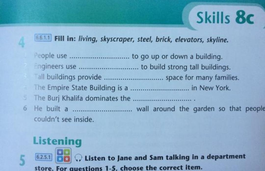 4 Skills 8c 6.6.1.1 Fill in: living, skyscraper, steel, brick, elevators, skyline. People use. Engineers use 1 2 3 Tall buildings provide. 4 The Empire State Building is a ...... The Burj Khalifa dominates the ... He built a 5 6 couldn't see inside. Listening ... to go up or down a building. ... to build strong tall buildings. space for many families. ... in New York. .. wall around the garden so that peop даю 55баллов