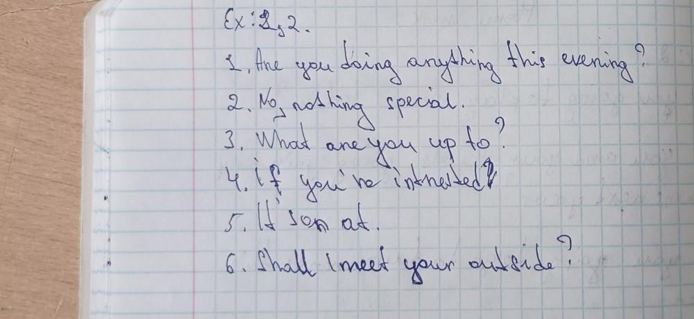 2)No, nothing special 3) What are you up to 4)if you're interested 5) it's on at 6)Shall l meet you outside