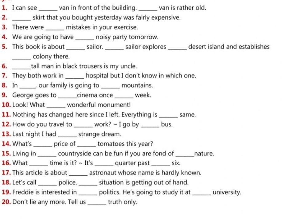 Zadanie 2. Wpisz a, an, the lub - (przedimek zerowy). Pamiętaj, aby nie zostawić pustych