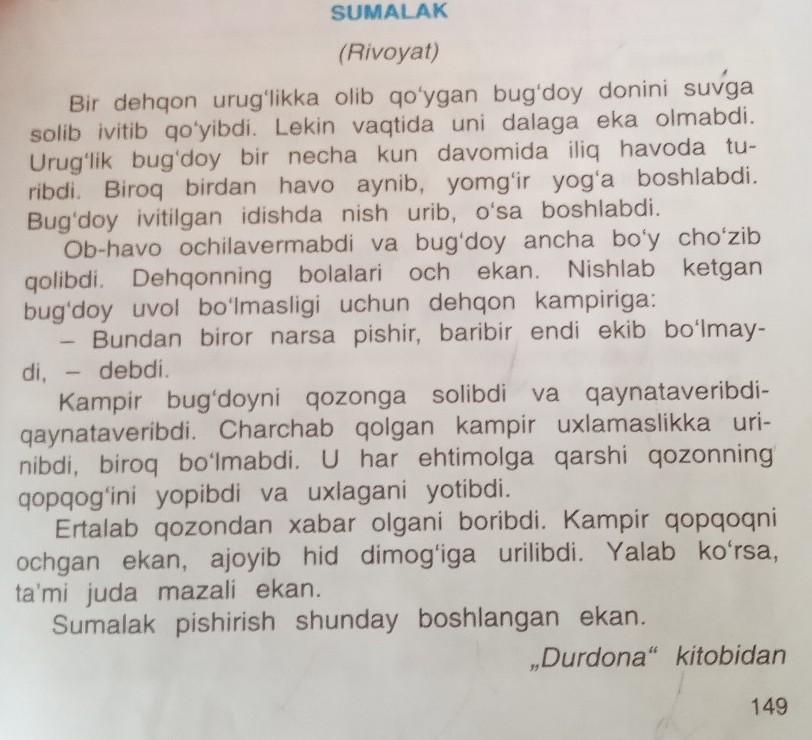 2.Kimning matnida eng ko'p maza-ta'm bildiruvchi sifatlar bor?" tanlovini tashkil qiling. Есть фотка "Sumalak rivoyati" А стих "Sumalagim-Sumalagim"